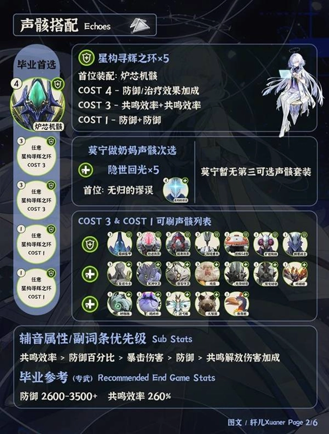 推荐优先星构寻辉之环五件套,提供治疗效果加成和队伍攻击力加成。COST4首位声骸装配炉芯机骸,提供10%共鸣效率。莫宁让队伍吃满增益刚需260%共鸣效率,COST3声骸基本上需要带两个共鸣效率。其余主词条用防御,莫宁吃的是防御。如果新套装不够用也可以先用隐世回光五件套。