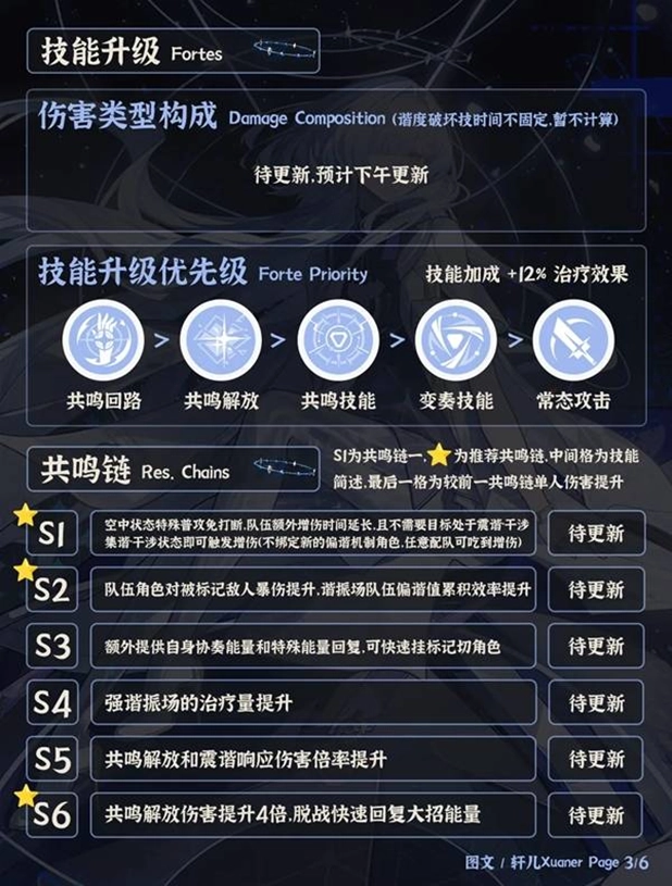 为共鸣解放伤害。共鸣链推荐抽取1/2/6链,1链很重要,当前环境如果不与琳奈搭配,需要1链来触发在其它队伍的40%额外增伤,1链抽取优先专武。2链给继续队伍提升暴伤和偏谐值累计效率,进一步提升拐力。如果想让莫宁输出,可以抽6链,大招伤害大幅提升,而且脱战回复大招能量,大世界会很舒适。