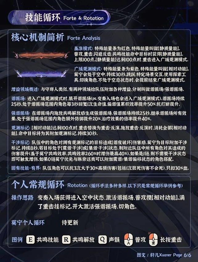莫宁作为鸣潮第二位限定五星奶妈,因其全面的辅助能力适配绝大多数队伍。她不仅能为队友回复生命值,还可提升偏谐值的累计效率以加快谐度破坏技的释放节奏,同时赋予队友更强的抗打断能力与防御力加成,并能通过延奏效果为全队带来25%的全伤害加深。当搭配琳奈这类可附加震谐/集谐偏移状态的队友,或是采用1链配置时,莫宁还能额外提供40%的全队增伤。此外,她具备出色的保人机制——可让队友抵御3次超过自身30%生命值的高额伤害(其中包含1次致命伤害),触发时仅扣除30%血量。综合拐力而言,莫宁与守岸人不相伯仲,而在偏谐体系中其表现更胜一筹。