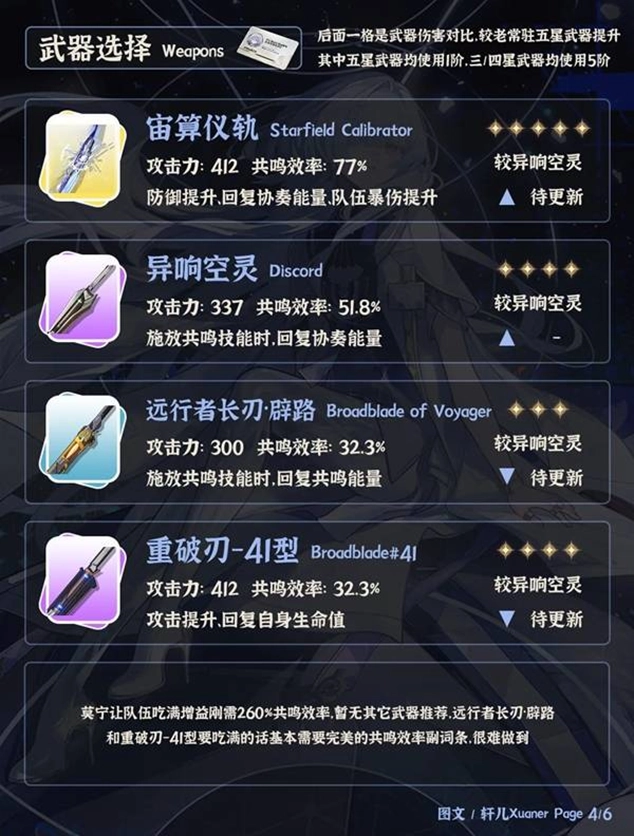 首选专武宙算仪轨。可以提供防御加成和协奏加快,队伍暴伤提升。专武不刚需,除此之外可以考虑异响空灵,莫宁主要吃武器的共鸣效率(要达到260%),因此最好使用这两把,远行者长刃·辟路和重破刃共鸣效率加的比较少,对副词条要求非常高。其它武器不推荐。
