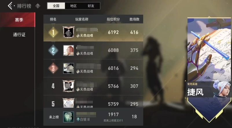 对于超凡及以下段位的玩家来说,晋升之路需要将段位评分提升至100,一旦达成这一目标,就能顺利完成竞技段位的晋升,但是当段位评分降至0时,再输掉一场比赛,竞技段位就会下降哦,所以大家要小心每一场排位都不能偷懒,而对于竞技段位在神话以上的玩家,他们将有机会计入排行榜,这个排行榜上面显示着所有无畏战魂以及神话玩家的排名、段位评分、竞技段位、ID、卡面、胜场等一系列详细的数据。