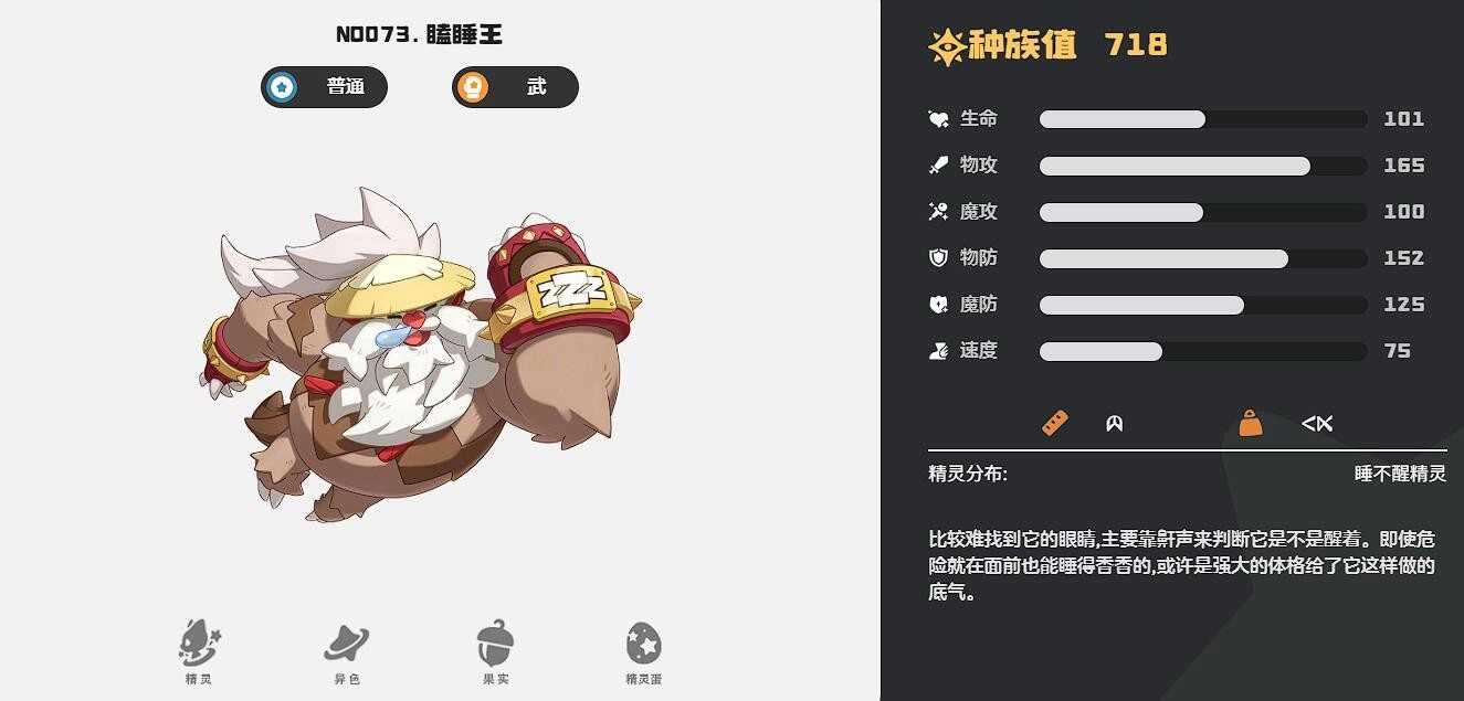 瞌睡王是普通系中兼具生存与爆发的代表,由白发懒人进化而来,可在维苏威火山口捕捉。它的特性“慢热型”需要队友通过击败敌人或触发闪避为其充能,能量满值后大幅提升物攻与暴击率,适合残局收割。技能“崩山击”对残血目标伤害提升50%,搭配“狂暴连打”可快速清场。
