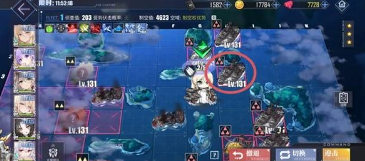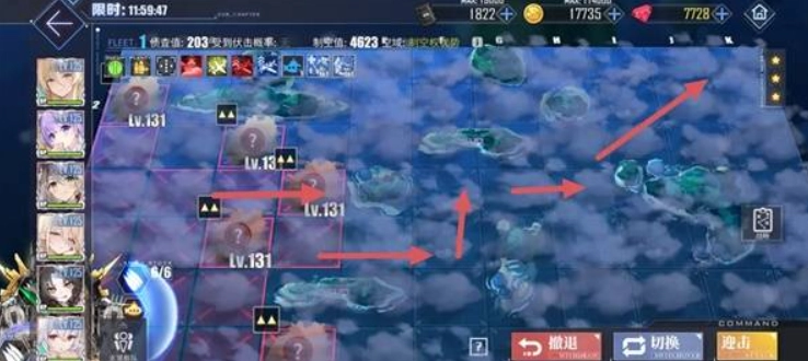 上图展示的是道中第四战,这个大型战列群实力相当强悍,人形战列敌人甚至能一击就击沉独角兽!前面三战不需要用到潜艇,而这张图里潜艇支援有一次在范围外发动的机会,建议在进入蓝海之前对这个敌人使用潜艇支援。