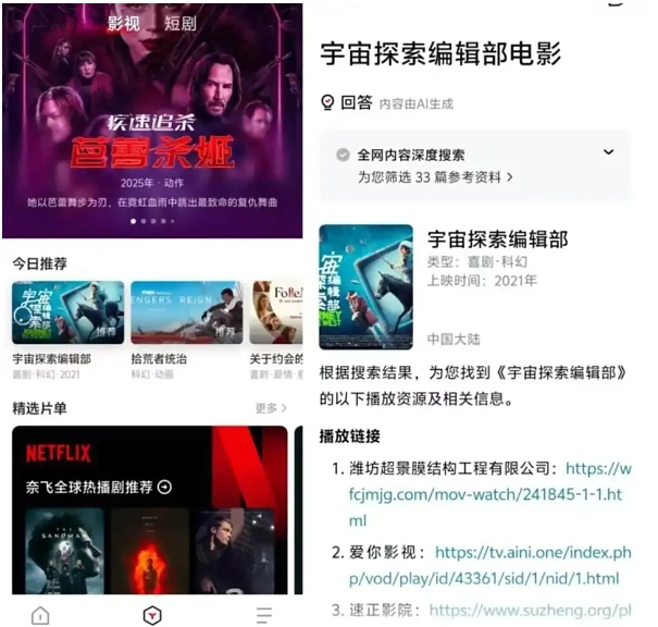 点击其中一部电影后,并不会直接进入到播放界面,而是跳转至搜索界面,AI会总结出部分播放链接,通过链接可以进行剧情的观看。此外,在搜索界面的最后,会有一段提示:建议优先选择官方渠道观看,遵守相关法律法规,尊重知识产权。