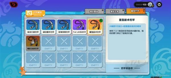 (3)一直使用深海传奇钓竿,直至攒出重型战术钓竿(第一天单靠收集进度是无法攒出的,需要出售部分渔获,渔获售卖可以见2.2渔币获取指南),之后使用重型战术钓竿