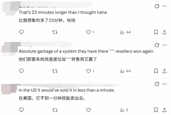 评论区的玩家认为实际速度比预想的要慢,要是在美国的话,1分钟就能售罄。