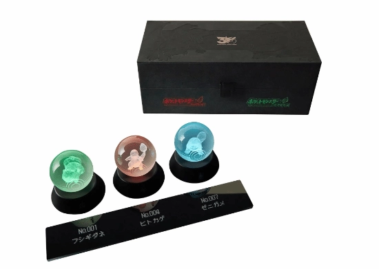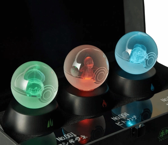 这个漂亮的中心装饰配有专用展示柜、一个底座和一个以不同颜色发光的亚克力板,代表初始宝可梦的元素类型。它需要九节AAA电池来驱动照明功能,且这些电池需单独购买。每套售价为19,800日元(约合870元人民币)。