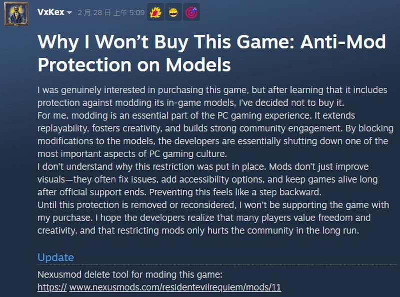 在Steam社区里,也有玩家表达了类似的担忧。他们猜测《生化危机9》的游戏模型或许加入了反Mod保护机制,并且对限制玩家创作的做法提出了疑问。Mod的作用不止于提升游戏画质、修复程序漏洞、优化无障碍体验,还能在官方停止更新后,让游戏的生命力得以延续。而限制这些功能,无异于是一种“倒退”。