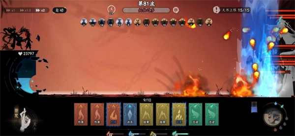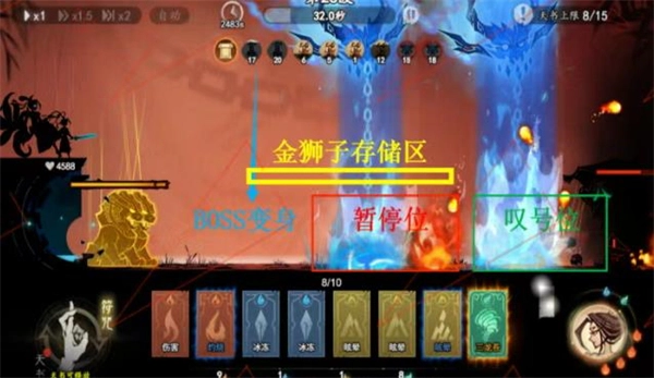 7、第三种情况中,若风煞的阶数超过6阶,那么至少要上3个风煞,此时倒计时卡8和1;若风煞阶数不足6阶,则风煞、业火、8阶琵琶、8阶水壶这几类加起来至少要有6本,且其中风煞至少3本。打法建议采用堵门输出的方式,所有控制类天书都围绕最右侧的刷新点来释放。
