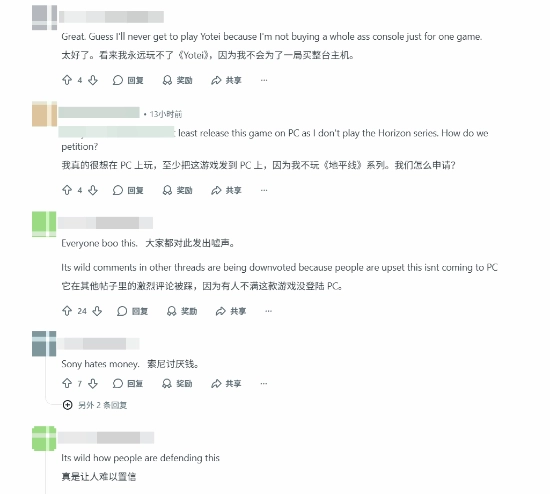 针对部分玩家的抵制情绪,也有人吐槽这种双标心态:“PS5没独占时,大家抱怨没理由买主机;现在像《羊蹄山之魂》这样的独占大作来了,大家又抱怨玩不到PC版。”