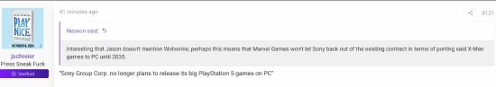 因为原文没有提到计划在秋季推出的《漫威金刚狼》,有网友对这款游戏能否登陆PC表示好奇:“有意思的是,记者没提及《漫威金刚狼》。这或许说明在2035年之前,漫威不允许索尼终止现有合同,索尼还得把这些X战警相关的游戏移植到PC平台。”