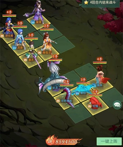 2、第二关:3号位妖龙、4号位鳐仙、6号位鸟人、7号位彩色蜈蚣、8号位狐妖。第一回合妖龙释放绝技玄冰碎攻击右侧列,同时对李忆如减神,防止其为敌方加血;鳐仙释放绝技触发冷冻,限制多个敌方出手,减少我方受击;鸟人绝技攻击右侧列补伤收割,仅留半血李忆如;彩色蜈蚣对王小虎挂毒,狐妖魅惑李逍遥并将其打至丝血。后续回合普攻收割残血即可满星通关,注意在布阵时需安排两个怪物与李忆如对位,持续压制其神量避免回血。