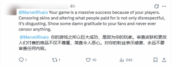 X博主Pirat_Nation发文称,由于部分玩家的强烈反馈,网易游戏对《漫威争锋》的角色皮肤进行了修改调整,该博主将此操作称作“审查”,此事在玩家群体中引发了广泛讨论。