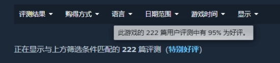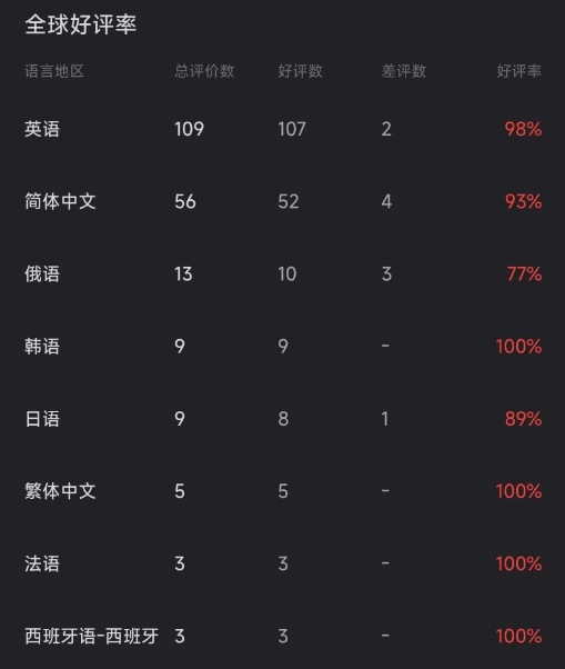 在现有的222条评价中,好评率仅为95%。其中,英语地区占评价数大头,共计109条评价,好评率为98%。简中地区位列第二,共计56条评价,好评率为93%。