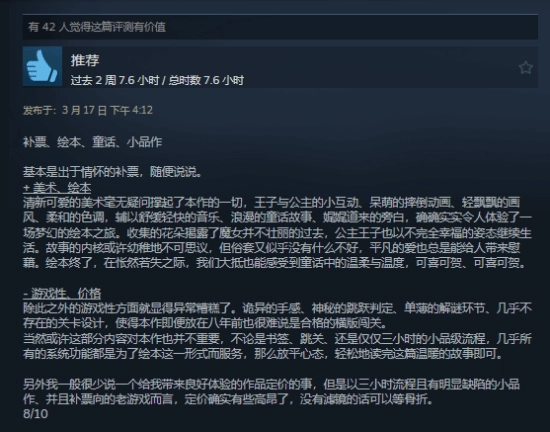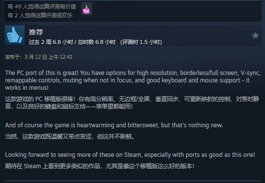 不少玩家出于情怀,给予了不错的评价。游戏本身出彩的地方在于其美术风格与剧情设定,虽然玩法层面略有欠缺,但移植工作做得相当到位,玩家对此也重点提出了表扬。