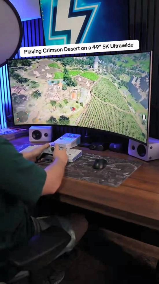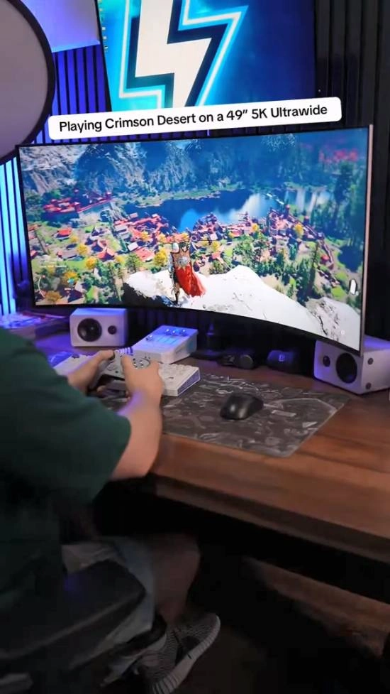 此外,博主还展示了在5K超宽屏上实时运行《红色沙漠》的画面,画面效果十分惊艳。