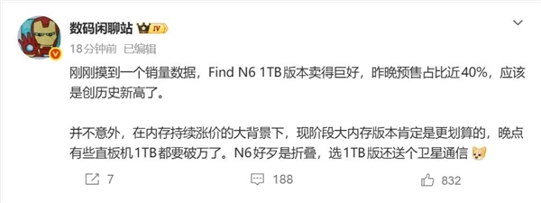 根据博主数码闲聊站的消息,Find N6的1TB顶配版本在市场预售阶段表现十分亮眼。昨晚的预售占比达到了近40%,这一数据刷新了该品牌的历史纪录。