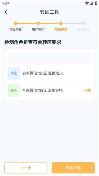 4、点击进入到“角色工具”中,之后点击“开始转移”按钮;即可进行角色转移系统了。
