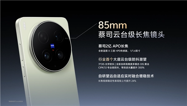 硬件层面,vivo X300 Ultra搭载了全新的蓝图与三星HP0联合研发的传感器。相比上一代,其信噪比指标提升了10%,色彩还原准确度提升了10.9%,而功耗大幅降低了约38%,与其匹配的是一颗85mm蔡司云台级长焦镜头。