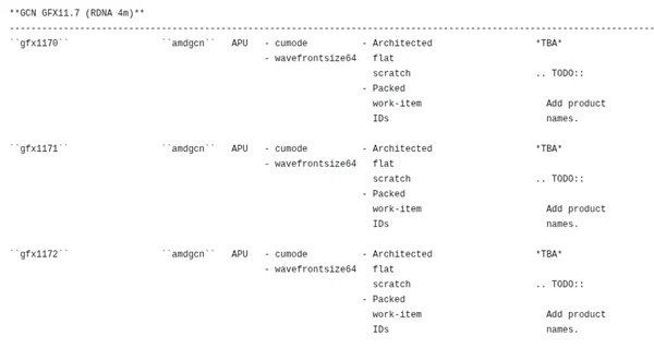 这两款与此前发现的GFX1170共同构成三款型号,都隶属于RDNA 4m标签范畴,并且指令集能力完全相同,由此可以确定AMD正在为下一代APU筹备多规格的集成GPU方案。