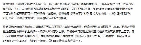 整体来看,这一功能几乎可以视为给所有Switch老游戏“免费重制”。尤其是2D画面风格的作品,以及部分重制游戏表现更为出色。在1080p下的显示效果也非常契合新屏幕。