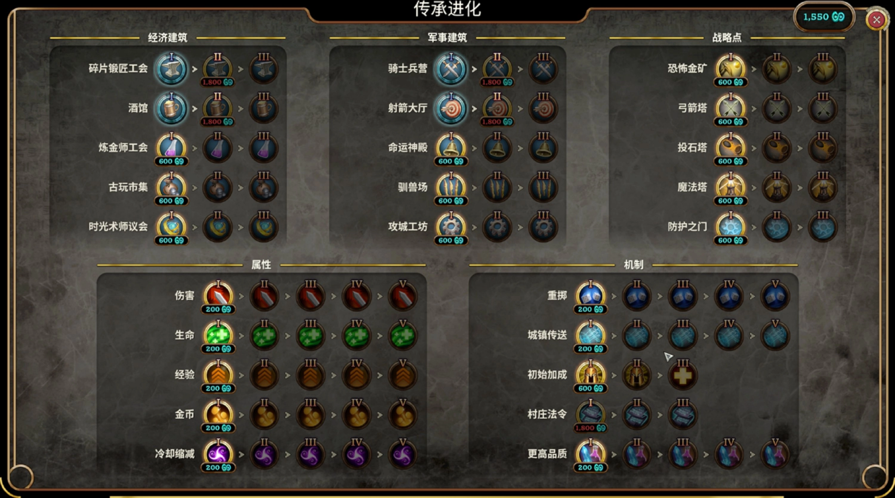 首先,游戏有着很强的经营策略要素。在局外成长解锁后,玩家共有五种经济建筑和五种军事建筑,它们不仅提供资源,还能自动生产补给药水和增益Buff——甚至是文明类游戏里常见的全局法令政策。这种机制为游戏带来了极强的策略深度,你需要权衡是先升经济以提升科技,还是初期爆塔爆兵,是点出攻击buff还是先解锁传送门控制地图。