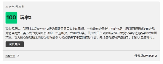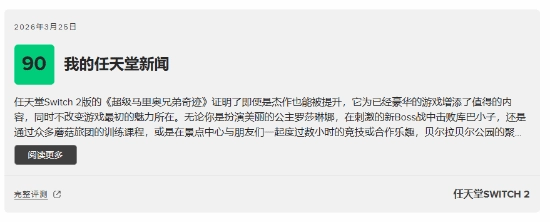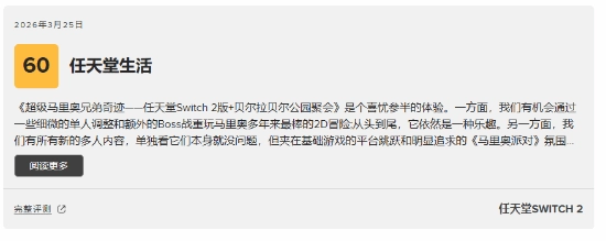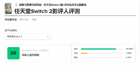 《超级马里奥兄弟:惊奇 Nintendo Switch 2 Edition + 同游铃铃公园》作为《超级马里奥兄弟惊奇》的重制版,整合了诸多新内容与强化功能。它在解决原版游戏存在的问题之余,还新增了富有挑战性的任务与首领战,并提供了多样的合作及竞技类多人迷你游戏。同时,游戏的画面表现与运行性能均有大幅优化,视觉呈现更为出众。截至目前,该作在MC站的评分为86分。