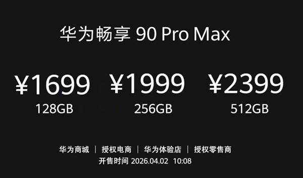 据华为商城信息,华为畅享90 Pro Max将于4月2日正式开售。这款机型的起售价为1699元,拥有飞天青、曜金黑、晨曦金和雪域白四种质感十足的配色,可供消费者挑选。