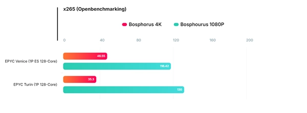 Kenya平台则测试了一颗128核256线程的"100-000001056-09"样品,同样运行在4.02GHz,搭配两条128GB DDR5-8000内存,在x265视频编码基准中进行了测试。