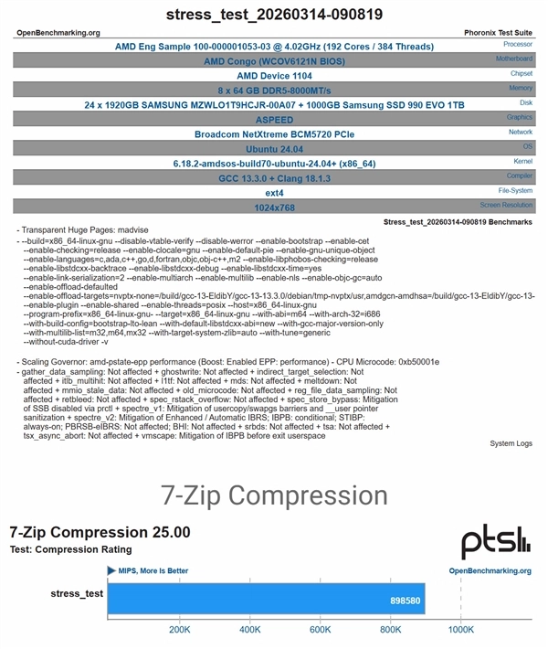 Congo平台测试了两款样品:最高端型号100-000001053-03配备192核384线程,基础频率4.02GHz,搭配8条64GB DDR5-8000内存。