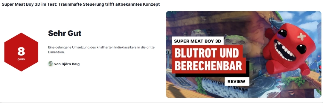 在游戏公布时,我相当怀疑。《超级食肉男孩》那种精准的平台跳跃,在三维空间里能玩出什么名堂?答案很简单:好得离谱!虽然偶尔会有估算深度的小问题——比如当你要把那个可爱的肉块挪到屏幕更远的地方时。但相比于其他方面出色的操控感,这些小插曲完全可以忍受。我也可以说游戏缺乏创新,因为所有新点子都是从《超级马里奥3D世界》等作品里借来的。但对于这些元素的最终呈现,我挑不出毛病。《超级食肉男孩3D》是系列的一次成功延续,它对你的挑战程度丝毫不亚于原作。