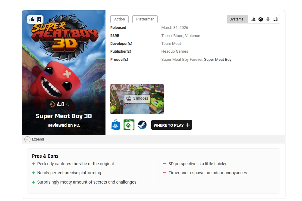 《超级食肉男孩3D》那刻意为之的高难度,被一些本身相对微小的问题放大了。当你看那个小家伙死了成百上千个小时后,这些小问题就累积起来了。复活时间慢了那么一两毫秒,而且决定一个关卡是否真正通关的那个至关重要的计时器,竟然在你还没操作之前就开始走了——这总是让我忍不住叹气,因为它逼我重来,还消耗了我更多的注意力。