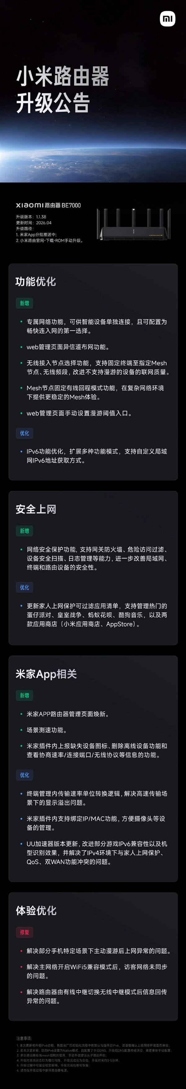 4月2日消息,近日,小米Wi-Fi 7路由器BE7000已完成1.1.38版本的升级,此次升级不仅修复了多个影响使用体验的问题,还新增了多项涉及网络、Mesh、安全以及米家APP的相关功能。