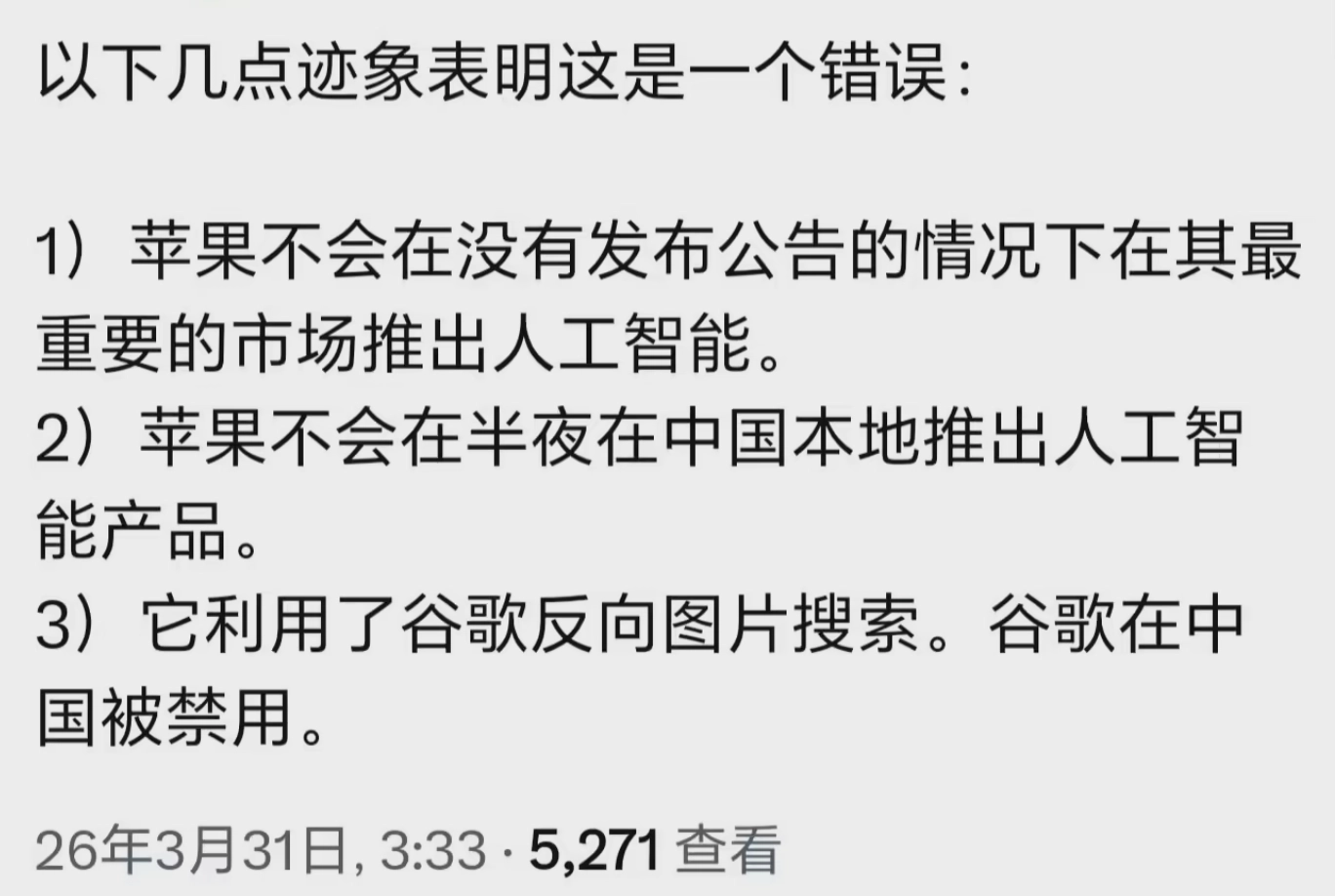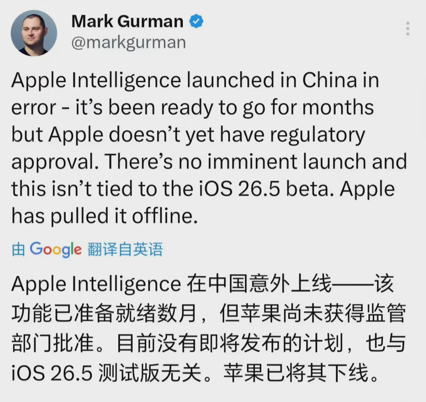 彭博社知名苹果记者马克·古尔曼第一时间发文澄清,明确表示这是苹果的误操作,并非官方发布。他指出,苹果不会在没有发布公告的情况下,在中国这个核心市场上线如此重要的AI功能;也不会在半夜1点至3点这个大多数人熟睡的时段推出新产品。此外,意外上线的版本竟然还在使用谷歌反向图片搜索功能,而谷歌服务在中国早已被禁用,这进一步证明了此次上线的非官方性质。