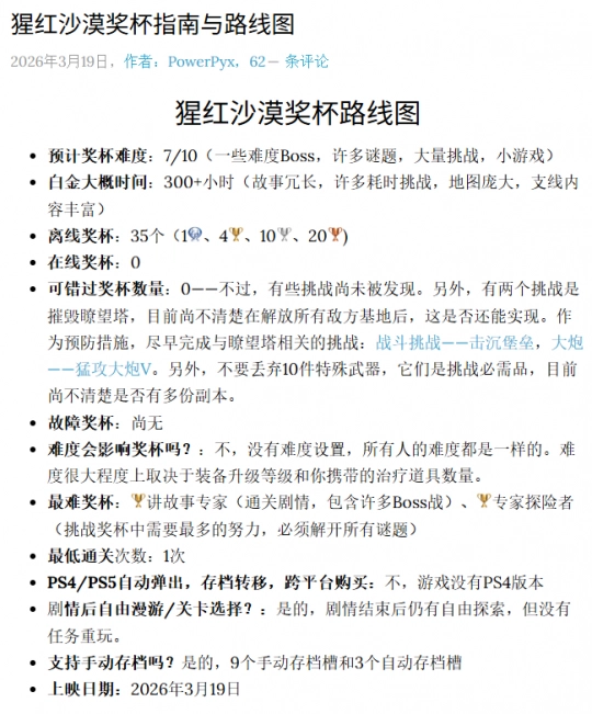 据长期专注于PlayStation奖杯攻略的网站PowerPyx估算,开放世界游戏《红色沙漠》的白金奖杯完成时间预计超过300小时。尽管游戏发售仅12天,已有少量玩家达成了这一“严苛”成就。