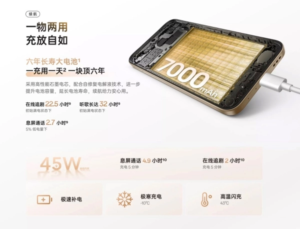 在续航方面,该机内置电池典型值为7000mAh、额定值6830mAh的大容量电池,官方宣称具备六年长寿特性,大幅延长电池有效使用周期,轻中度使用场景下可轻松实现两到三天一充,彻底缓解频繁充电的焦虑,彻底告别电量焦虑问题;在充电规格上,支持45W超级闪充与45W UFCS融合快充,同时兼容UFCS、PPS以及13.5W PD等多种协议,充电兼容性更强。