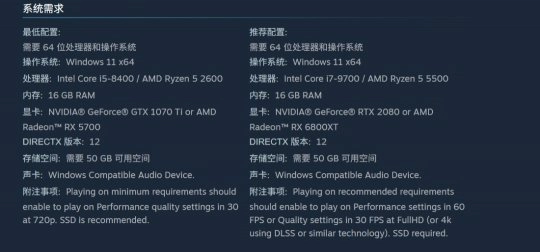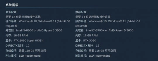 入门配置,PC玩家至少需要16GB内存和RTX 2070显卡,这意味着GTX 10系显卡看起来很难跑的动这款游戏。