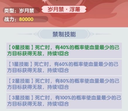 死亡后附加无敌盾,适合墨智、端木极等前排角色。即使朱雀印的免疫效果用完,浮屠的无敌盾也能让他们多站一回合,为队友争取时间。