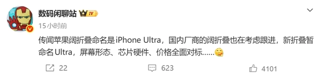 这款折叠屏iPhone的命名同样备受市场关注,数码博主“数码闲聊站”透露其可能定名为iPhone Ultra,这一消息甚至引发了国内厂商是否会跟进该命名、并在产品力与定价上全面对标的讨论。不过,苹果目前尚未官方公布折叠屏iPhone的任何具体信息,包括最终的发布上市时间、产品命名等,一切仍需以官方正式披露的内容为准。