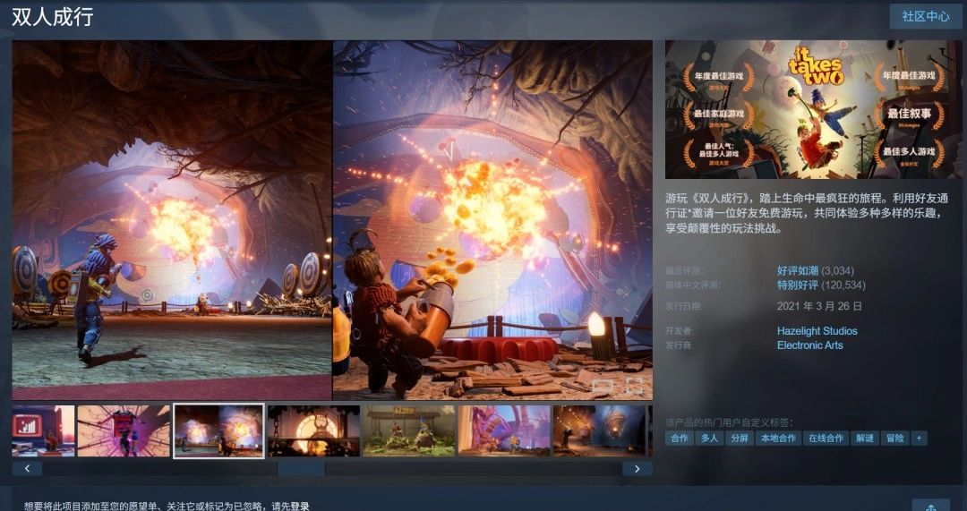 可以看到以上三款游戏发售时间间隔在3-4年左右,而获得TGA 2021年度游戏的《双人成行》销量最好,成功突破了3000万。
