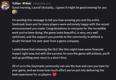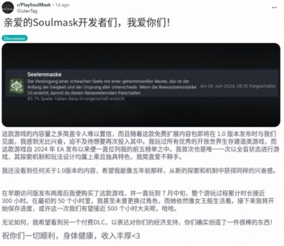 海外玩家得知游戏正式版上线热情高涨。在海外社区Reddit上,有一篇题为《亲爱的〈灵魂面甲〉开发者,我爱你们!》的帖子,玩家写道:“这款游戏的内容量之多简直令人难以置信,我玩过所有出色的开放世界生存建造类游戏,自2024年EA发布以来,它一直稳居我的前五名。”“你们确实创造了一件很棒的东西!”