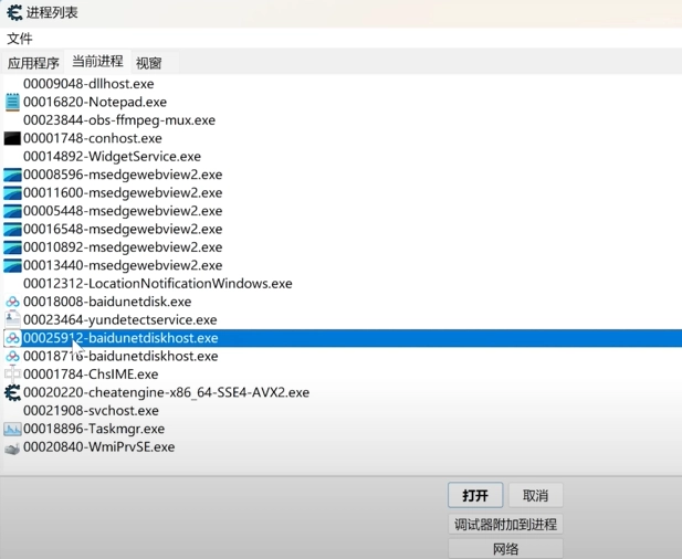 8、选择完以后就能找到百度网盘的PID进程了,如下图,接着点击打开