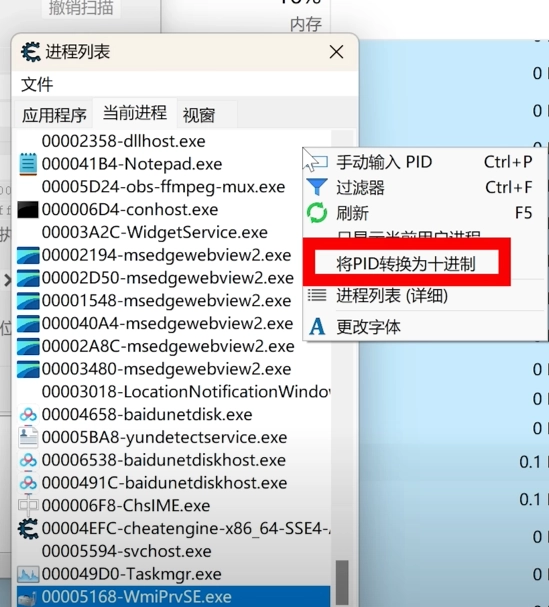 7、然后我们鼠标右键,选择将PID转换为十进制