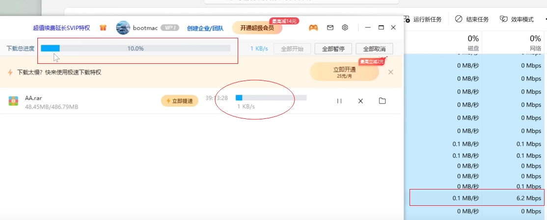 提示:修改好以后下载界面显示的还是被限速的网速,但实际上的下载速度已经不被限制了,如图