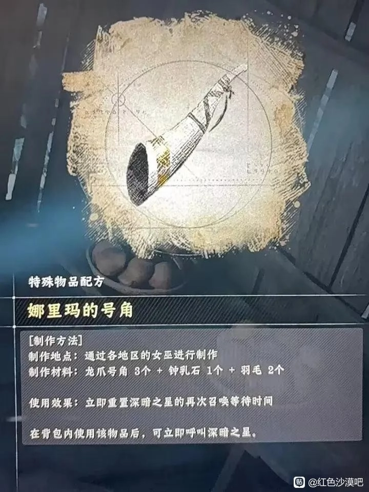 该道具的名字叫做娜里玛的号角,可以直接刷新龙的cd。据玩家透露,该制作图纸需要通过派遣佣兵完成富饶森林遗迹地区的任务获得,并且还需要使用龙爪号角才能进行制作。
