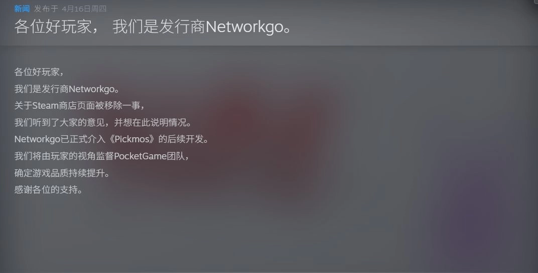 发行商Networkgo确认,游戏《精灵皮可》(现更名为《Pickmos》)已从数字平台Steam的商店页面移除。