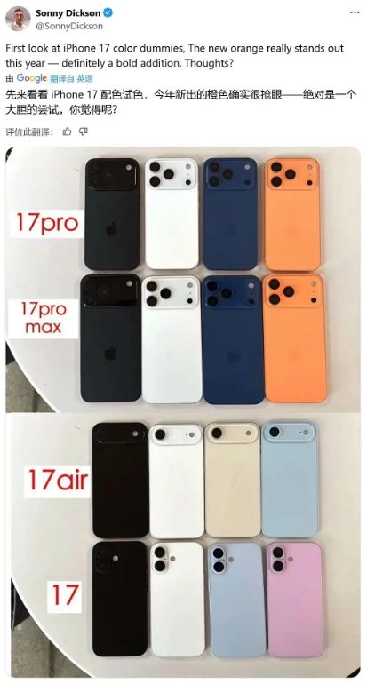 SonnyDickson今天(7月30日)在X平台发布推文,展示了一张图片,展示了苹果iPhone17、iPhone17Air、iPhone17Pro、iPhone17ProMax四款机型机模的颜色阵容。
