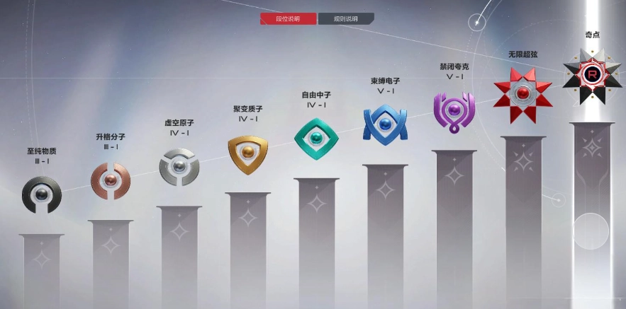 聚变质子段位和自由中子段位处于第4个阶段,这个阶段需要玩家对角色拥有更加充分的了解,并且能够根据局势的变化灵活选择合适的角色。自由中子段位也称过渡阶段,很多新手玩家只要通过了这个等级的段位,剩余的段位晋升就会很快,而且各个玩家之间的实力差距也不会太大,所以在排位赛时要格外的小心谨慎,借助不同角色的属性以及技能完美的组合,取得胜利。