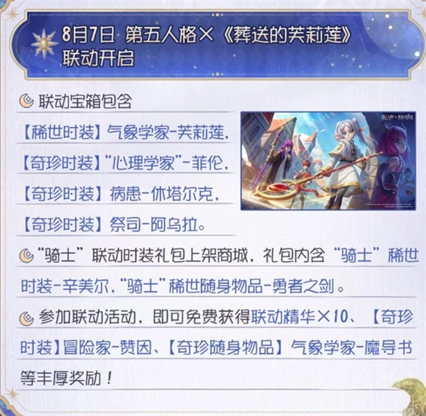 《第五人格》玩家注意啦!8月7日,游戏与《葬送的芙莉莲》联动正式开启。从稀世时装“气象学家-芙莉莲”,到奇珍时装“心理学家-菲伦”“病患-休塔尔克”等,多款精美皮肤登场。参与“葬送的庄园巡演”活动,还能免费获联动精华、冒险家赞因奇珍时装等奖励。快来庄园,解锁这场奇幻联动盛宴。