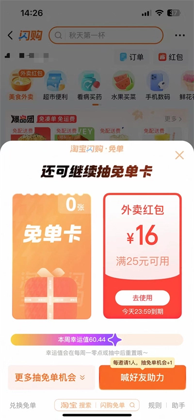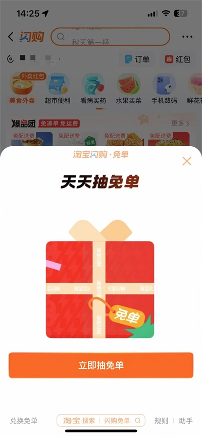 1、前往淘宝闪购搜索闪购免单即可进入天天抽免单活动界面